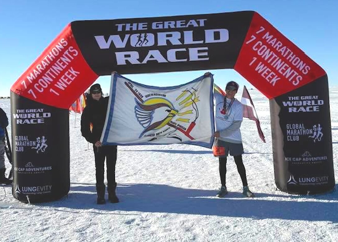 Allen holds the Flandreau Santee Sioux Tribal flag after finishing the first of seven marathons in seven days in Wolf’s Fang, Antarctica in November. With him is fellow runner William Maunsell of Ireland. Maunsell had just finished a 2:14 marathon in Dublin a month earlier and came on the trip to set the world record of completing the 7-7-7 the fastest. While he was ahead of pace to do so, Allen said Maunsell was unfortunately injured in the 6th marathon and chose to drop out.